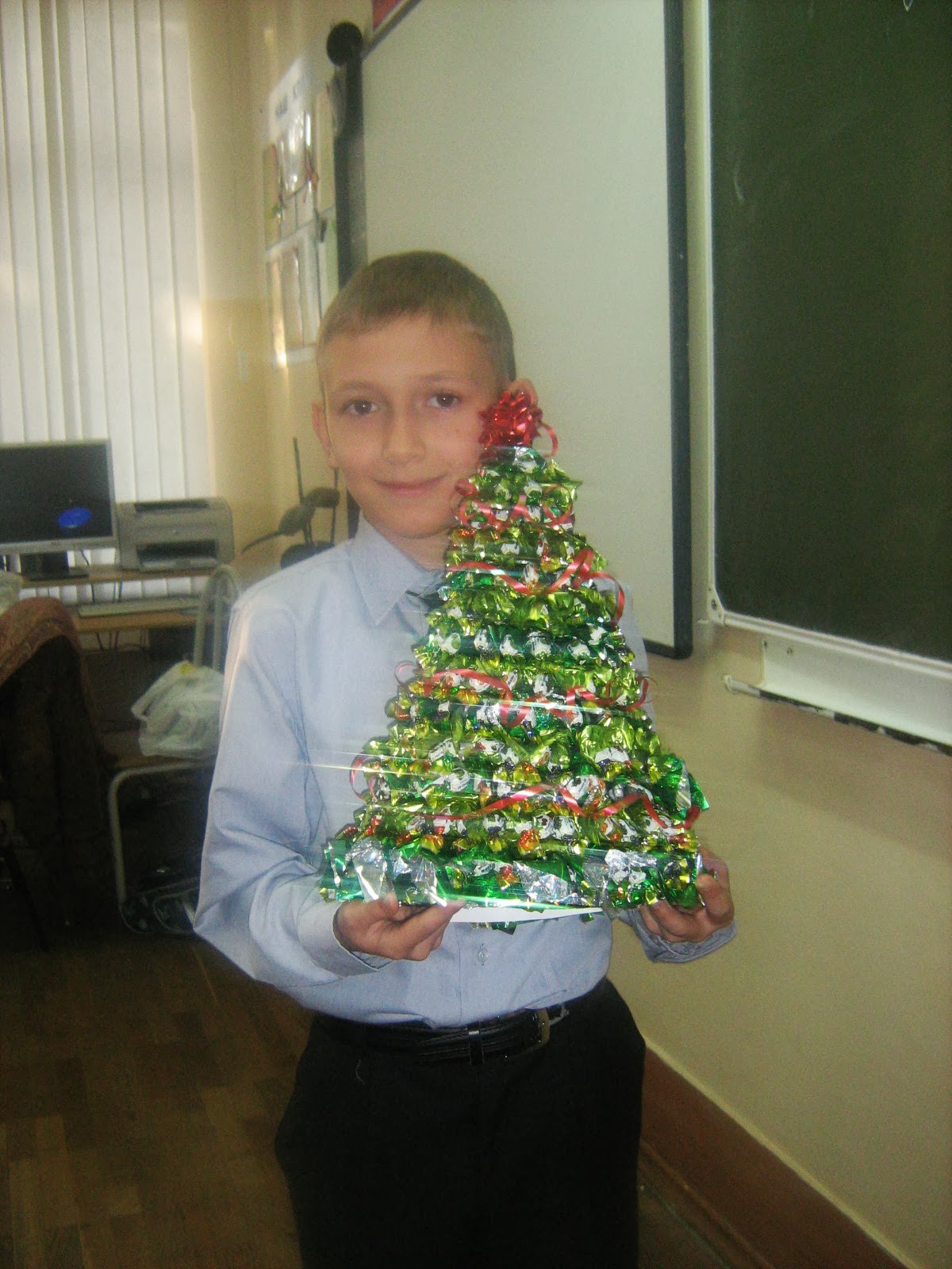 делали ёлки из конфет, бумаги, ни-ток, мишуры и даже макарон. Несколько работ участвовали в муниципальном отборе и прошли на городской конкурс
